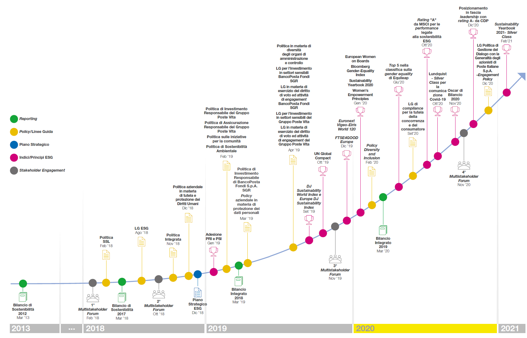 In questo senso, Poste Italiane negli anni ha intrapreso un importante percorso di consolidamento della propria strategia di Sostenibilità orientata alla creazione di valore condiviso per i propri stakeholder e allo sviluppo della propria reputazione.